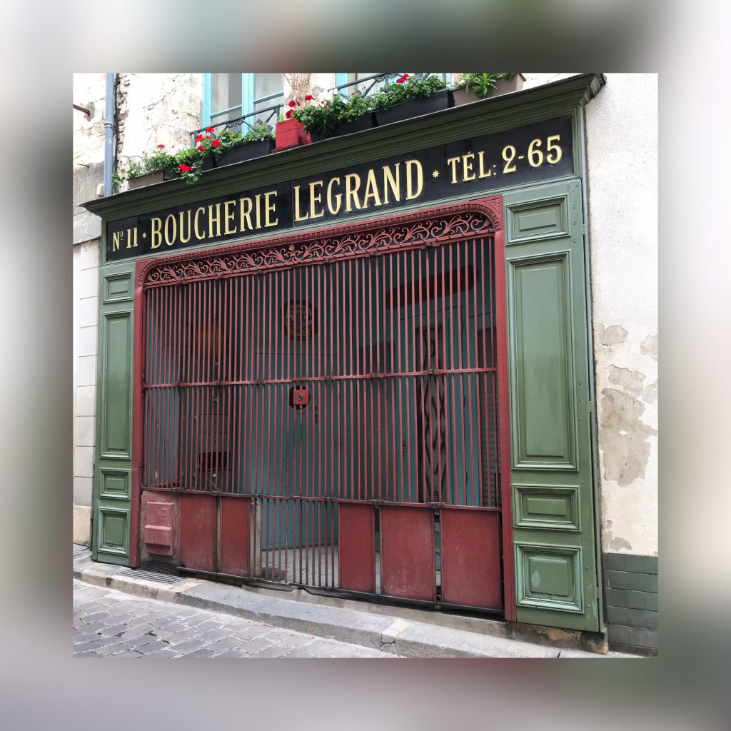 Cette magnifique devanture de boucherie se trouve 11 rue de la Herse. Depuis le 18ème siècle, elle appartient à des marchands bouchers. Vers 1900, elle est tenue par la famille Legrand, comme l’indique l’enseigne. Il semblerait qu’elle ait appartenu à Émile Legrand et ses fils dont Georges, boucher aussi. La particularité de cette belle enseigne aux inscriptions dorées est son numéro de téléphone à 3 chiffres.